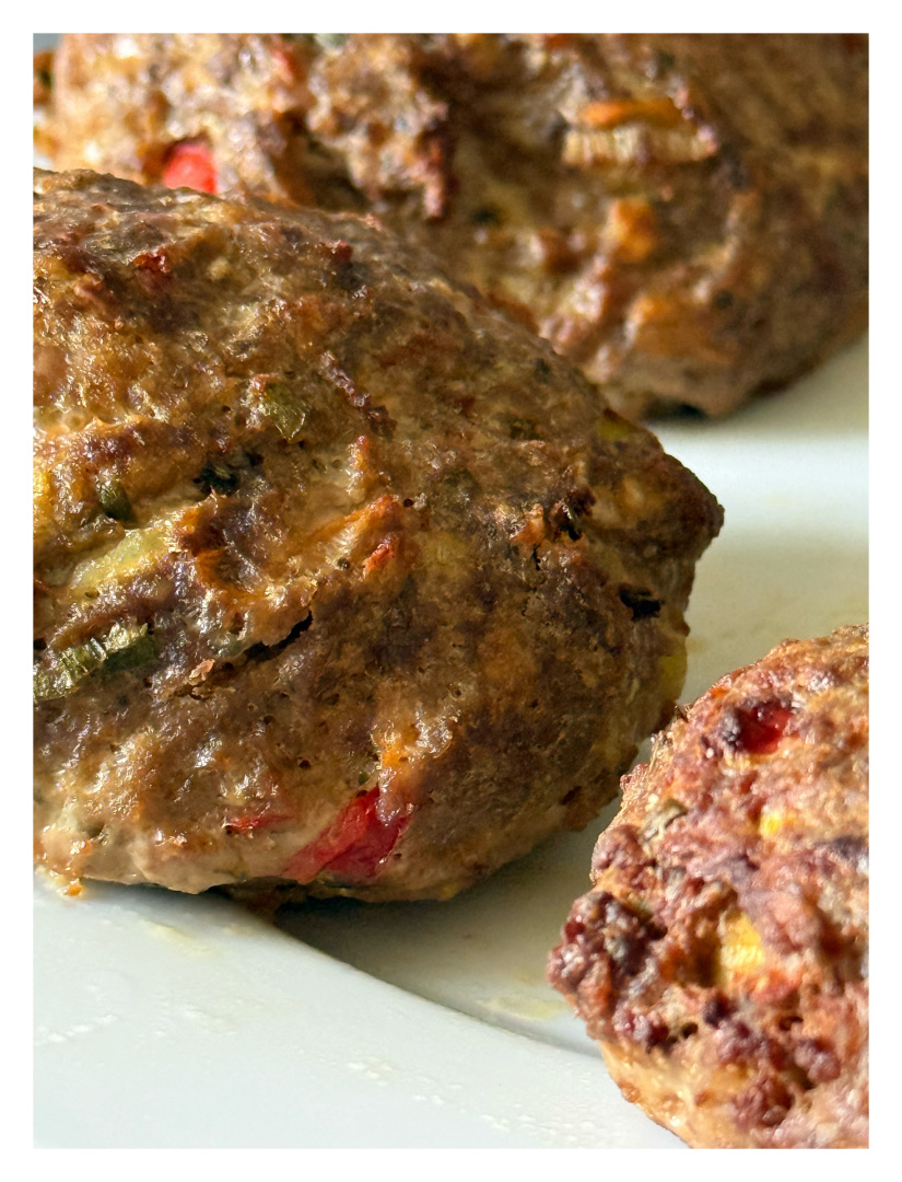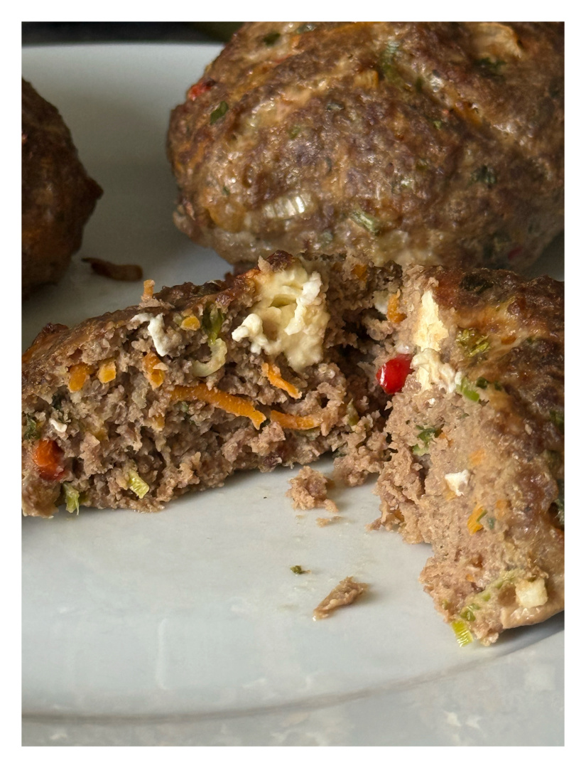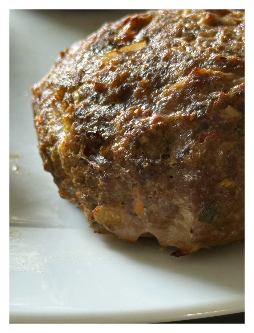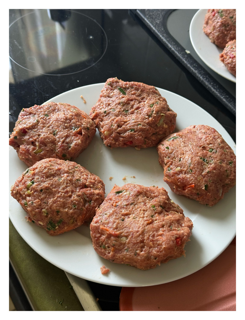 Dann treten die Patros-Würfel auf die Bühne: kleine Salzkristall-Giganten, die sich im heißen Kern der Frikadelle zu schmelzenden Überraschungen wandeln – wie kleine Geheimgänge in einer Burg aus Fleisch. Petersilie und Schnittlauch flattern wie grüne Fähnchen hinein, frisch, lebendig, fast als wollten sie die Masse überreden, doch bitte ein klein wenig eleganter zu wirken.